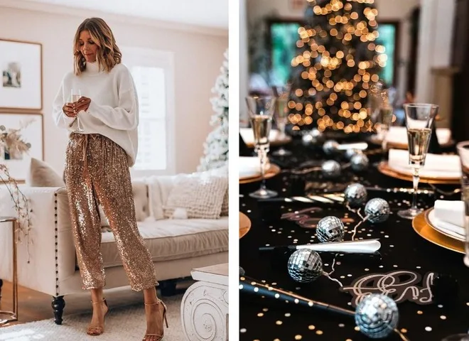 - Образы с блестящими брюками. В твоем образе будет одна яркая деталь — это переливающиеся брюки. Хочешь выбери брюки из блестящей ткани, а хочешь — брюки с глиттером или блестками. Верх может быть совсем простым — белая рубашка, свитер пастельного оттенка или обычная базовая футболка, жакет. Уравновесить образ помогут массивные серьги с камнями или сверкающий клатч.
