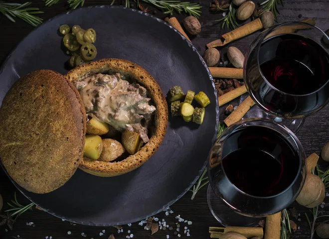 Бефстроганов в сливочно-томатном соусе в ржаном хлебе