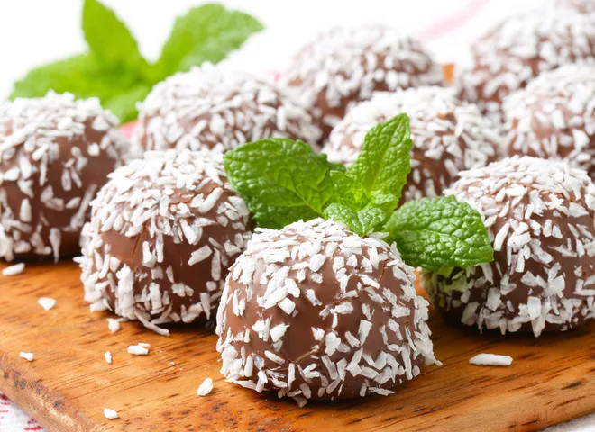 • Растопи черный шоколад. Обмокни конфеты в шоколаде и посыпь кокосовой стружкой. Поставь в холодильник на 15 минут.