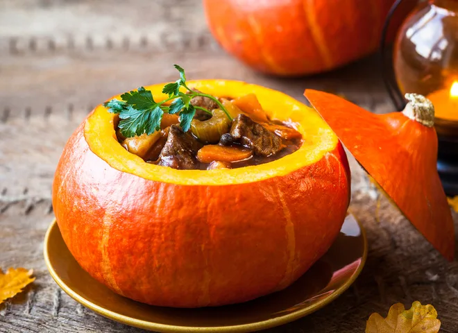 Уже давно гурманы не ассоциируют тыкву с кашей или десертом. Мясные блюда с этим овощем получаются намного более вкусными. Мясо же, запеченное в цельной тыкве, получается мягким и нежным и пропитывается вкусным сладковатым соком. tochka.net предлагает приготовить в духовке тыкву, фаршированную свининой и овощами. Такое блюдо не только порадует богатой палитрой вкуса, но и станет украшением праздничного стола.