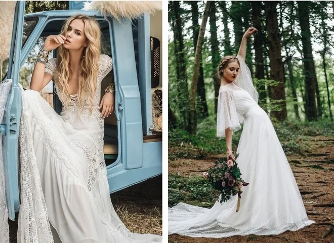 - Платья с налетом ретро. Это могут быть короткие лаконичные модели без рукавов, или платье с объемными рукавами, или длинное свадебное платье в пол из атласа, которое ты можешь дополнить атласными перчатками и даже пышная модель длины миди, с которой можно сочетать соломенную шляпу и букет из полевых цветов.